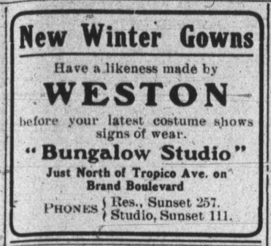 3 [Advertisement] Edward Weston, “New Winter Gowns: Have a likeness made by Weston…” Glendale News, 28 October 1910, unpaginated p. 6.
