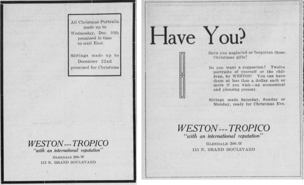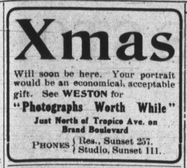 Edward Weston. [Advertisement] “Have You?” Glendale Evening News 18 December 1914.