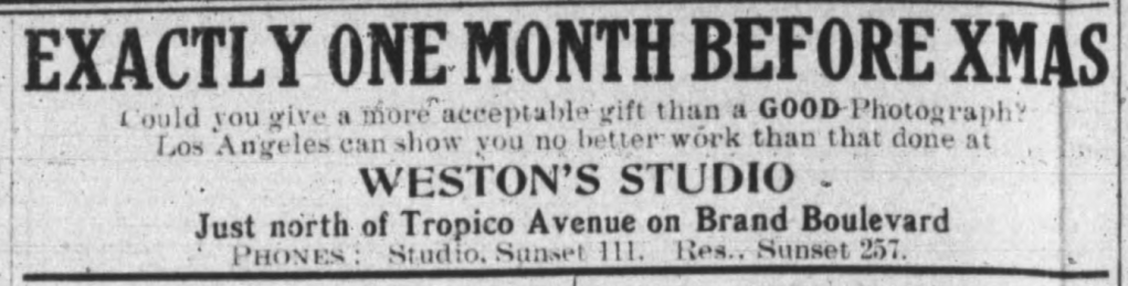 4 [Advertisement] Edward Weston, “Xmas Will soon be here,” Glendale News, 11 November 1910, unpaginated p. 6.