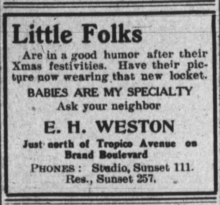 6 [Advertisement] Edward Weston, “Little Folks,” Glendale News, 30 December 1910, unpaginated p. 6.