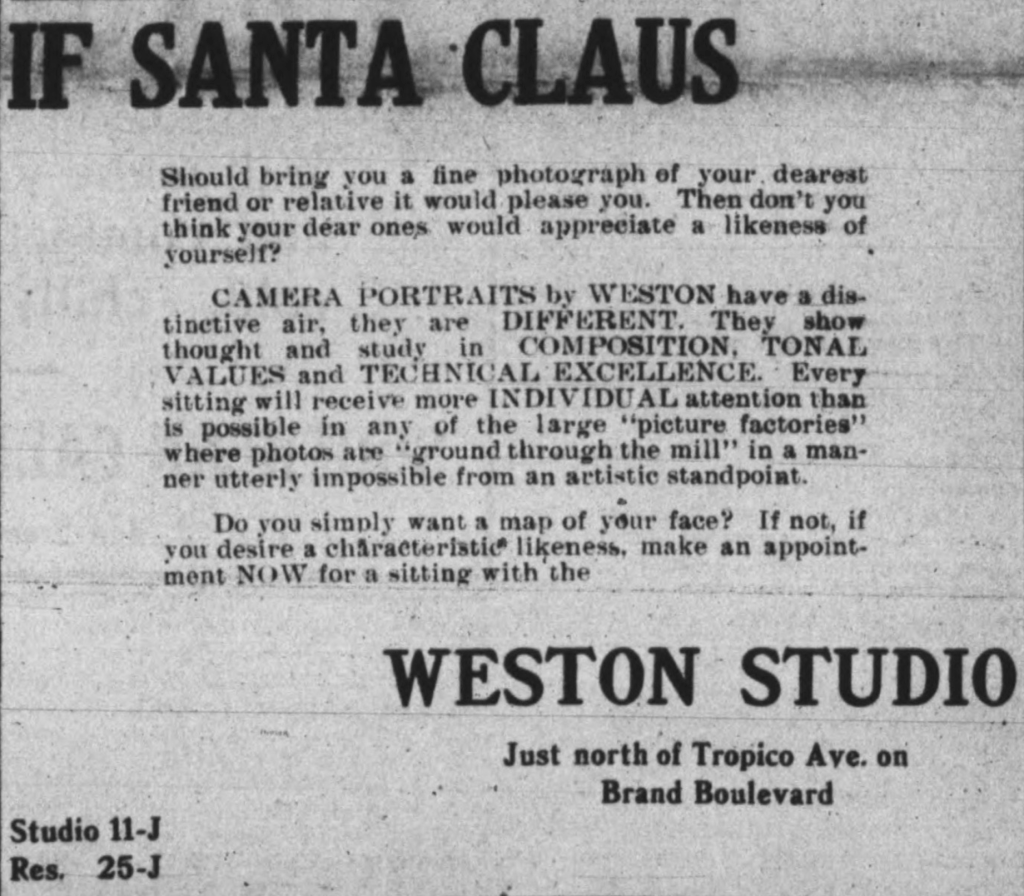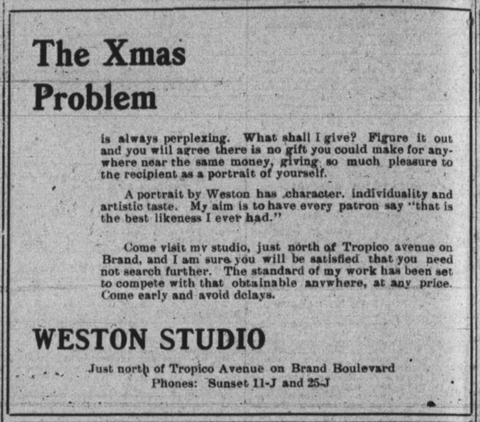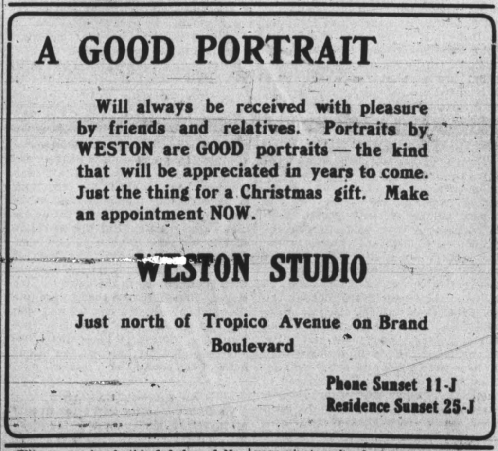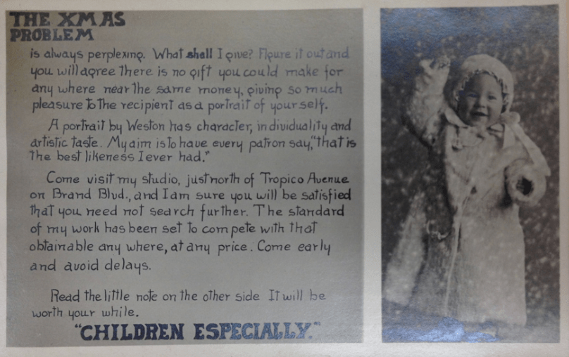 “Dear Friend, / Do you know that in Large Studios—‘Picture Factories’ would be a more applicable name—the work turned out must of necessity lack individuality? Why? Because one party makes your sitting, another develops the plate, another re-touches it, another does the printing, and still another mounts and finishes it! Small wonder if the finished result falls far from being a likeness of the original! / Pictures finished at the Weston Studio are created from start to finish by one man; they are not a conglomerate mixture of what half a dozen parties guessed you ought to look like! Now you can see why Weston’s work is ‘Different’. / A Christmas suggestion is on the other side. / Weston Studio / Just North of Tropico Ave. on Brand Blvd. / Phone SUNSET 11-J for an appointment. Res. Phone: SUNSET 25-J.”