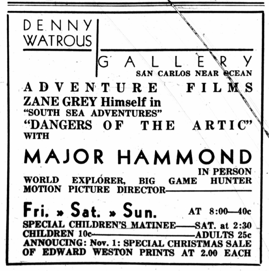 The first occurrence is a notice from Carmel’s influential Denny-Watrous Gallery in the Carmel Pine Cone on 26 October 1934. Amidst ballyhoo for screenings of “Adventure Films” and an appearance by “World Explorer, Big Game Hunter and Motion Picture Director” Major Hammond, the Gallery inserted this diminutive yet alluring tiding: “ANNOUNCING: NOV. 1: SPECIAL CHRISTMAS SALE OF EDWARD WESTON PRINTS AT $2.00 EACH.”[14]