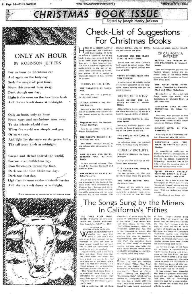 18 Joseph Henry Jackson, “Christmas Book Issue: Check-List of Suggestions For Christmas Books,” San Francisco Chronicle, 8 December 1940, “This World,” p. 15.