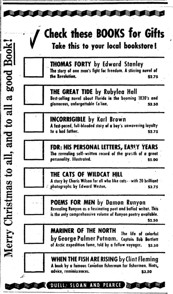 19 [Advertisement] Duell, Sloan and Pearce, “Check These Books for Gifts…,” San Francisco Chronicle, 30 November 1947, “Christmas Book Issue,” p. 22.