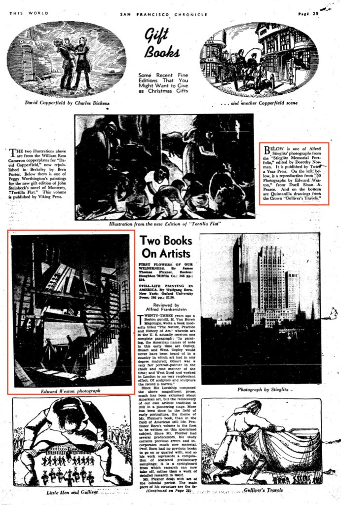 Beginning in 1940 Weston’s books supply ample gift-giving fodder. Publication of California and the West (1940) elicited a flurry of Christmas recommendations in newspapers throughout the country, including The New York Times Book Review,[15] The Boston Herald,[16] and the Cleveland Plain Dealer.[17] On 8 December 1940, the San Francisco Chronicle “Christmas Book Issue” glowingly described it as “A magnificent collection of Edward Weston’s photographs…”[18]