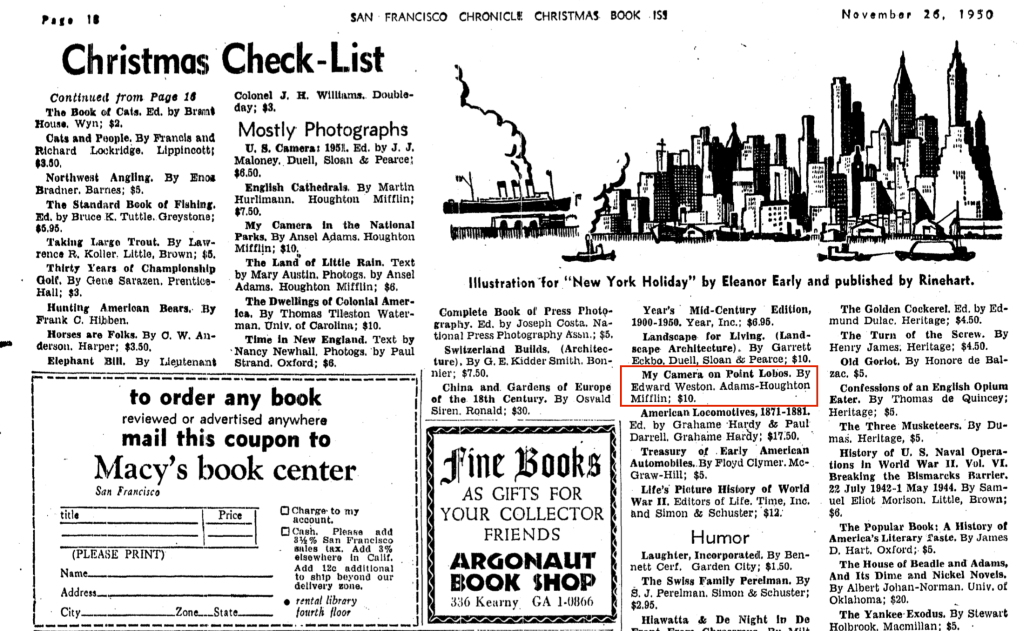 Not surprisingly, Christmas 1950 ushered in gift-giving recommendations for My Camera on Point Lobos, as seen in this 26 November 1950 listing in the San Francisco Chronicle Christmas Book Issue.[21]