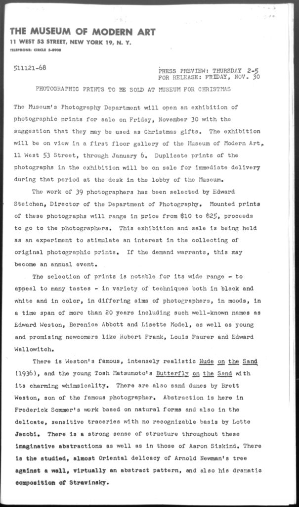 22 [Press Release] [Museum of Modern Art], “Photographic Prints To Be Sold At Museum For Christmas,” New York: Museum of Modern Art, 21 November 1951. (Collection of the Museum of Modern Art, New York)