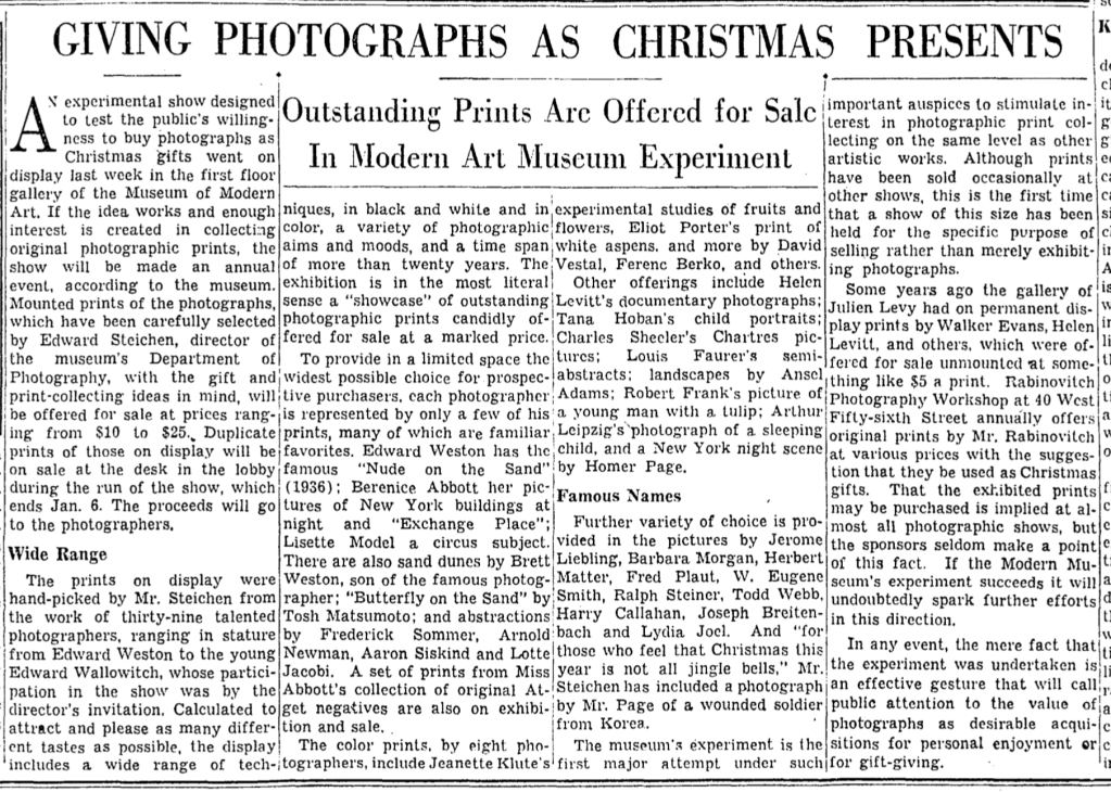An experimental show designed to test the public’s willingness to buy photographs as Christmas gifts went on display last week in the first floor gallery of the Museum of Modern Art. If the idea works and enough interest is created in collecting original photographic prints, the show will be made an annual event, according to the museum. Mounted prints of the photographs, which have been carefully selected by Edward Steichen, director of the museum’s Department of Photography, with the gift and print-collecting ideas in mind, will be offered for sale at prices ranging from $10 to $25. Duplicate prints of those on display will be on sale at the desk in the lobby during the run of the show, which ends Jan. 6. The proceeds will go to the photographers. / Wide Range / The prints on display were hand-picked by Mr. Steichen from the work of thirty-nine talented photographers, ranging in stature from Edward Weston to the young Edward Wallowitch, whose participation in the show was by the director’s invitation. Calculated to attract and please as many different tastes as possible, the display includes a wide range of techniques, in black and white and in color, a variety of photographic aims and moods, and a time span of more than twenty years. The exhibition is in the most literal sense a ‘showcase’ of outstanding photographic prints candidly offered for sale at a marked price. / To provide in a limited space the widest possible choice for prospective purchasers, each photographer is represented by only a few of his prints, many of which are familiar favorites. Edward Weston has the famous ‘Nude on the Sand’ (1936); Berenice Abbott her pictures of New York buildings at night and ‘Exchange Place’; Lisette Model a circus subject. There are also sand dunes by Brett Weston, son of the famous photographer; ‘Butterfly on the Sand’ by Tosh Matsumoto; and abstractions by Frederick Sommer, Arnold Newman, Aaron Siskind and Lotte Jacobi. A set of prints from Miss Abbott’s collection of original Atget negatives are also on exhibition and sale. / The color prints, by eight photographers, include Jeanette Klute’s experimental studies of fruits and flowers, Eliot Porter’s print of white aspens, and more by David Vestal, Ferenc Berko, and others. / Other offerings include Helen Levitt’s documentary photographs; Tana Hoban’s child portraits; Charles Sheeler’s Chartres pictures; Louis Faurer’s semi-abstracts; landscapes by Ansel Adams; Robert Frank’s picture of a young man with a tulip; Arthur Leipzig’s photograph of a sleeping child, and a New York night scene by Homer Page. / Famous Names / Further variety of choice is provided in the pictures by Jerome Liebling, Barbara Morgan, Herbert Matter, Fred Plaut, W. Eugene Smith, Ralph Steiner, Todd Webb, Harry Callahan, Joseph Breitenbach and Lydia Joel. And ‘for those who feel that Christmas this year is not all jingle bells,’ Mr. Steichen has included a photograph by Mr. Page of a wounded soldier from Korea. / The museum’s experiment is the first major attempt under such important auspices to stimulate interest in photographic print collecting on the same level as other artistic works. Although prints have been sold occasionally at other shows, this is the first time that a show of this size has been held for the specific purpose of selling rather than merely exhibiting photographs. / Some years ago the gallery of Julien Levy had on permanent display prints by Walker Evans, Helen Levitt, and others, which were offered for sale unmounted at something like $5 a print. Rabinovitch Photography Workshop at 40 West Fifty-sixth Street annually offers original prints by Mr. Rabinovitch at various prices with the suggestion that they be used as Christmas gifts. That the exhibited prints may be purchased is implied at almost all photographic shows, but the sponsors seldom make a point of this fact. If the Modern Museum’s experiment succeeds it will undoubtedly spark further efforts in this direction. / In any event, the mere fact that the experiment was undertaken is an effective gesture that will call public attention to the value of photographs as desirable acquisitions for personal enjoyment or for gift-giving.”[23]