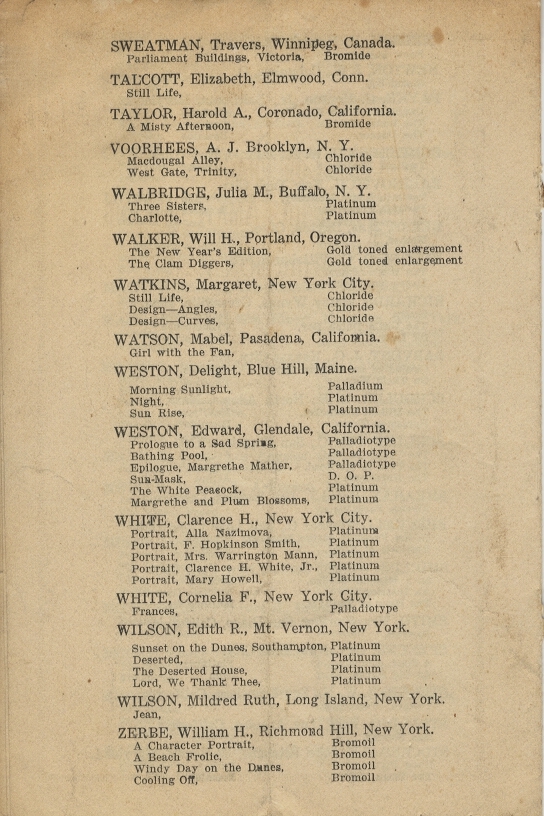 Journeying to nearby Denmark, we find two interesting publications with Weston content. Not surprisingly, the earliest, from 1920, relates to an exhibition: the catalogue to the Copenhagen Photographic Amateur Club Exhibition: American Section, held from August–September 1920.[12] Six Weston photographs are listed on the back page of this exhibition checklist.