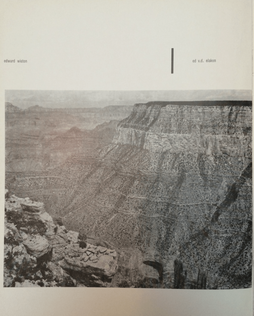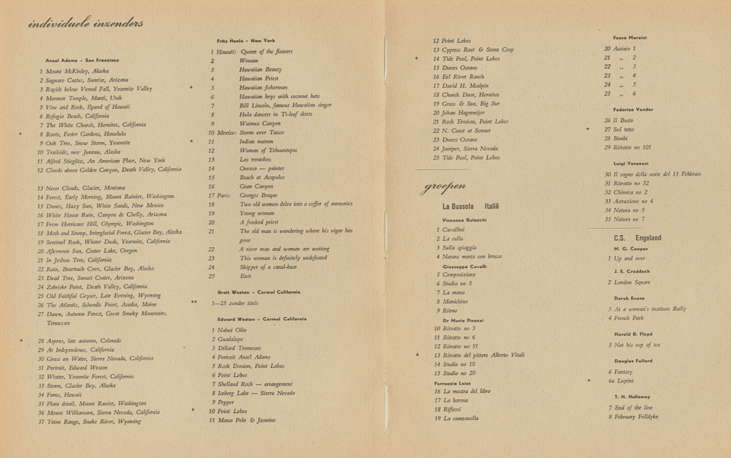 We conclude with the 1958 catalogue from the final venue of the traveling exhibition, Fotografie als Uitdrukkingsmiddel: Foto-tentoonstelling 1957-1958 [Photography as an Expressive Medium].[11] Weston exhibited ten photographs in this show. Frustratingly, the checklist provides dates but not titles, although, as indicated by the catalogue illustration below, the single photograph listed from 1941 was clearly Grand Canyon.