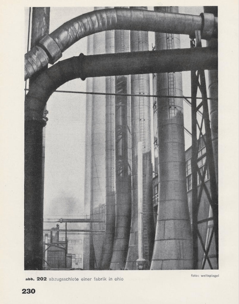 Pipes and Stacks, Armco also appeared in Laszlo Moholy-Nagy’s 1929 book, Von Material zu Architektur, again without crediting Weston.[5] Moholy-Nagy must have obtained his print from Der Welt Spiegel, not Weston, as indicated by the illustration caption: “abb. 202 abzugsschlote einer fabrik in ohio foto: weltspiegel.” [factory chimneys in Ohio photo: weltspiegel]