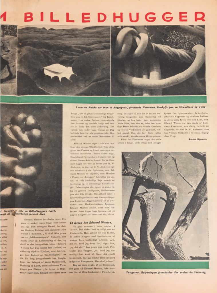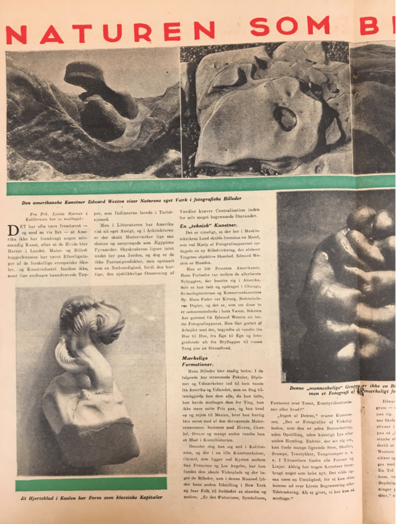 Nature as Sculptor / It has often been suggested – and with some truth – that America has not brought forth an art of its own since the Whites became masters of the land. Painting and sculpture have been emulations of the various European schools, and there have been no crafts to speak of, excepting the rugs that Indians make for tourists. / America has made its mark in literature, however, and masterworks of architecture have been achieved that are just as beautiful and distinctive as the Egyptian Pyramids. American skyscrapers resemble nothing else on Earth, and yet they are not products of fantasy, but created of necessity, because the premium placed on fast and efficient business requires centralization within already quite limited areas of land. / A ‘Technical’ Artist / It is fitting that here in the land of machines a man has emerged who, with the help of a camera, has discovered a new pictorial effect that reveals the objective beauty of things [that is, things as objects – perhaps, ‘simple things’ or ‘things themselves’ or ‘things as things’?]. Edward Weston is this man. / He is 100 percent American. His ancestors were among the very first immigrants to settle in America. Weston himself was born and raised in Chicago, the city of butchers and canners. His father was a surgeon, his grandfather a poet, and it is as though these two spirits live on as one in his being. Edward Weston received his first camera at the age of sixteen. He was immediately taken with the work of photography, wandering from house to house, from neighborhood to neighborhood, photographing everything from weddings to seaweed washed up on the beach. / Peculiar Formations / His pictures got progressively better. The following years saw a steady stream of prizes, diplomas and commendations from both America and abroad. One day, however, he chucked them all, claiming that he had received them for achievements he did not care much about anymore. He pulled up stakes and left for Mexico, where he was quickly drawn to the renaissance in painting taking place there. Along with Rivera, Charlot, Orozzo, and many others, Weston ushered in a new era in the history of art. / Eventually, Weston settled in California: in the little artists’ colony of Carmel, on the coast between San Francisco and Los Angeles. There, Weston found his ideal workplace and took the pictures that are featured this month in his second New York exhibition: these peculiar photographs that cause people to stop in their tracks and wonder aloud, ‘Is it Futurism, Symbolism, a tonal fantasy, fairy tale illustration, or what?’ / ‘None of these,’ answers the artist. ‘They are photographs of reality, without retouching, without staging, without artificial light or any other such humbug. Anyone who looks around can find any number of similar stones, shells, mushrooms, pieces of wood, piles of seaweed, et cetera. All forms and lines can be found in existence. No artist has ever introduced anything new. And it would be impossible to do so, anyway, because we we cannot go beyond life’s limitations or parameters. All is given, we have only to receive.’ / Thus, Edward Weston has no program, as such – he does not want any kind of ‘ism’ attached to him or his work. In his view, an art that results in a particular school or direction is dead on arrival: it atrophies in the frame. ‘We should not attempt to perfect Nature, but rather strive to reveal it. And to that end, the photographic lens [Edward Weston’s only cost five dollars] is a sure and objective aide when used with insight and patience.” [that bracket is actually part of the quote – appears, as such, in the original.] For a long time, he took pictures of snail shells; he was taken with their dimensions, their refractions of light, the strange effects of their surfaces. ‘They look like orchids,’ say viewers, taken with their strange magnificence. ‘It’s just plain and simple snail shells on a piece of writing paper,’ laughs the artist. In another period, he took pictures of bananas, toying with and manipulating them in a quest for the right view. That continued, until the day his sons freed him from such problematic experiments by eating the bananas! / Edward Weston searches for the most stringent objectivity in all of his motifs. He doesn’t just present the form and the light; one gets a palpable sense of the material: the tree seems rugged, the snail shell fine and beautiful, the seaweed wet and slimy, the stone cold and hard. For a Dane, it is natural to think of H.C. Andersen, and while H.C. Andersen was not quite as subjective in his interpretations as Edward Weston is objective, the moral of Andersen’s story, “The Bell,” echoes strongly in Weston’s work, although the two came to their marvelous revelations by markedly different paths. A bell-pepper of Weston’s looks exactly like a grumpy, grey-bearded troll; pebbles, lying in the mid-day sun on a little stretch of beach, seem like little tots out for a walk. An egg-slicer [for 25 øre (one-quarter Danish Crown, i.e., cheap)] becomes an apotheosis of machine engineering. Edward Weston smiles at our surprise. Nothing is further from his mind than to present things as anything other than what they are. / A Visit with Edward Weston / We walk together through his atelier in Carmel. It’s as plain and peaceful as a priory cell. He shows me his treasures, thick portfolios full of the fruits of many years’ work. ‘This is what I live for,’ he says, ‘and those,’ he points to some portraits on the wall, ‘are what I have mainly been living on. When it comes to people, I have sometimes had to make a compromise. One has to live, after all.’ / But one realizes quickly that those people who go to Edward Weston don’t come to be made pictorially beautiful. They come to get a faithful rendering of themselves for posterity to remember them by. And he allows that amusing wart to stay 