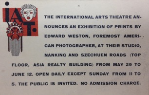 19 [Exhibition Announcement] [International Arts Theatre], The International Arts Theatre Announces an Exhibition of Prints By Edward Weston… Shanghai, China: International Arts Theatre, May 1933. [Postcard] (Collection of the Edward Weston Archive, Center for Creative Photography, University of Arizona; Scrapbook A)