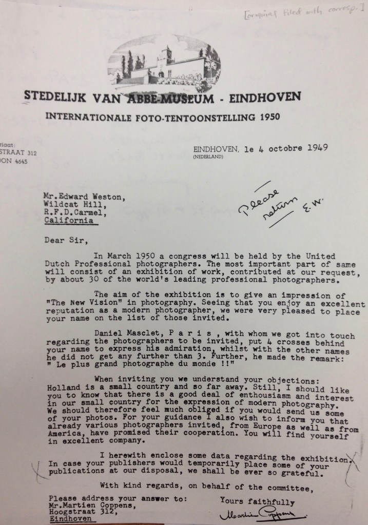 9 Typewritten letter from Martiens Coppens to Edward Weston; Stedelijk van Abbe-Museum letterhead, dated 4 October 1949. (Edward Weston Archive, Center for Creative Photography, University of Arizona, Box 35, Folder 17)