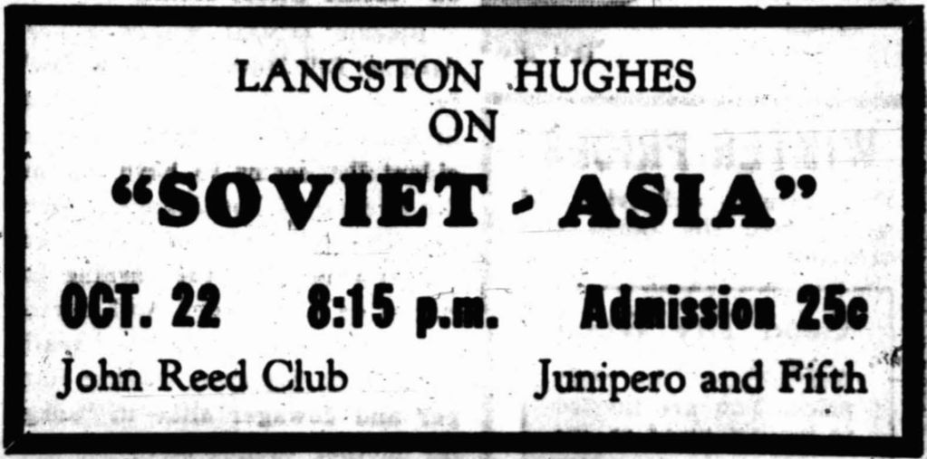 Soon after settling in, Hughes joined the Carmel chapter of the marxist John Reed Club and, drawing upon his recent travels, lectured there on “Soviet – Asia.”[7]