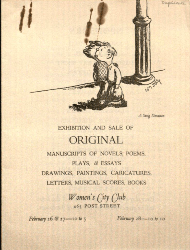 The list of contributors to this fundraiser reads like a Who’s Who of 1930s arts and letters. To name but a few: authors Robinson Jeffers, D.H. Lawrence, Theodore Dreiser, Ezra Pound, Countee Cullen, Carl Van Vechten (manuscripts and photographs), Sherwood Anderson, John Dos Passos and Bertrand Russell; photographers Edward Weston, Brett Weston, Imogen Cunningham, Johan Hagemeyer, Consuelo Kanaga, Lewis Hine, Edward Steichen, Sonya Noskowiak, and Ansel Adams; and artists William Steig, John Howard, Max Ernst, Henrietta Shore, Jo Davidson, and Anton Refregier.[11] [See Note 11 for a full list]