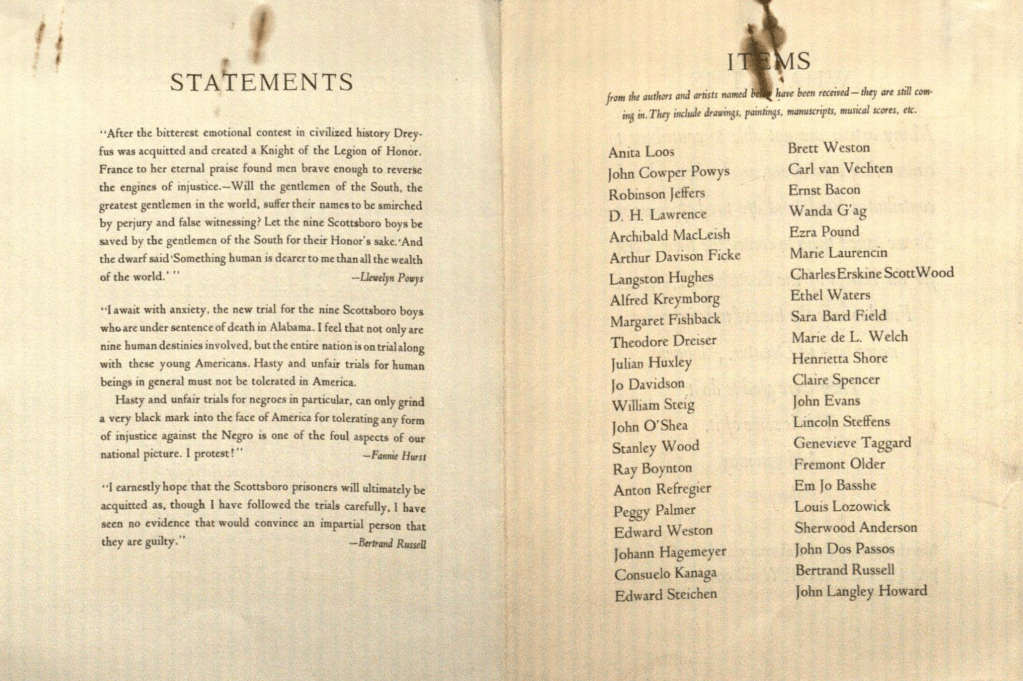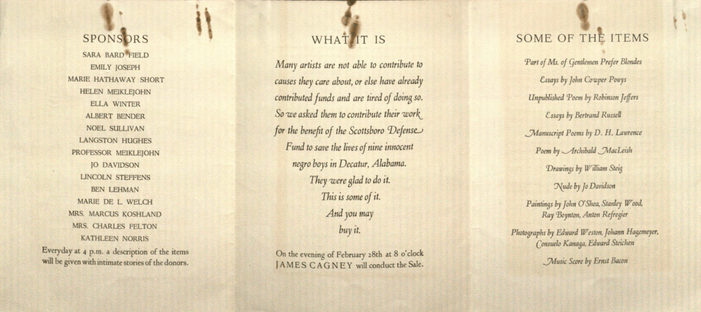 PAINTINGS, LITHOGRAPHS, DRAWINGS, ETC. / 1. Boynton, Ray / Water color, ‘Carmel Mission’ / 2. Boynton, Ray / Charcoal Drawing, ‘Landscape’ / 3. Boynton, Ray / Water color, ‘Landscape’ / 4. Cagney, James / Pen and Ink Sketch, [typed but struck through:] ‘Steffie’ [handwritten insertion, in pencil:] Gorky / 5. Covarrubias / Cartoon, reprint, signed, ‘W.C. Handy’ / 6. Davidson, Jo / Crayon drawing, ‘Dancer’ / 7. Davidson, Jo / Crayon drawing, ‘Dancer’ / 7. Davidson, Jo / Pencil drawing, ‘Nude’ / 8. G’AG, Wanda / Original drawing for ABC BUNNY, ‘F’ is for Frog’ / 9. W.C. Handy / 3 photographs signed / 10. Hine, Lewis / Photograph, ‘One Mile From Daylight’ / 11. Lozowick, Louis / Lithograph / 12. Palmer, Peggy / Water color, mounted and framed, ‘Le Bibliophile’ / 13. Refregier, Anton / 4 drawings / ‘Fisherwoman’ – pencil / ‘Lake’ – water color / ‘N.Y., 1928’ – crayon / ‘Strike’ – water color / 14. Seymour, Ralph Fletcher / Etching, ‘Luck with Alcario’ / 15. Sheridan, Joseph / Pastel, ‘Gaity’ / 16. Shore, Henrietta / Mounted lithograph, ‘Indian Woman and Child’ / 17. Shore, Henrietta / 2 lithographs, ‘The Women of Oaxactl’ / 18. Steichen / Mounted photograph, ‘Magnolia’ / 19. Steig, William / Original drawing / 20. Reprint of drawing — Steig / 21. Wesselhoefft, Mary / Mounted poster, ‘Industry Bound’ / 22. Wesselhoefft, Mary / Water color, ‘Still Life’ / [p. 2:] / PAINTINGS, LITHOGRAPHS, DRAWINGS, etc., page 2. / 23. Weston, Edward / 5 photographs / ‘Robinson Jeffers’, signed by Jeffers, inscribed to Scottsboro Boys / ‘D.H. Lawrence’ / ‘Lincoln Steffens’, signed by Steffens / 2 Still Life Photographs, signed by Weston, inscribed to Scottsboro Boys / 24. White, Margaret Bourke / 13 mounted photographs / 25. Wood, Stanley / Water color, 16” x 20”, ‘The House at Cannery Cove’ / 26. Van Vechten, Carl / 9 photographs of Ethel Waters, signed by Waters and van [sic] Vechten / 27. Wilson, Barbara / Pencil sketch of a Negro worker, in a frame 18” x 21” / 28. Young, Ralph / Photograph, ‘Line and Form’ / 29. Ward, Lynd / 4 woodcuts / 30. Block, Julius / 2 lithographs / 31. Kanaga, Consuelo / 2 photographs, Negroes / 32. Hagemeyer, Johan / Photograph, ‘Robinson Jeffers’ / Photograph, ‘Hands’ / 33. Hagemeyer, Johan / Photograph, ‘Bust of Jeffers by Jo Davidson’ / 34. O’Shea, John / Black and White / 35. Noskowiak, Sonia / Dunes of Oceano / MANUSCRIPTS / 1. Gordon, Taylor, negro playwright / ‘Ziogaboo Dream’, typewritten script, 292 pages / Hicks, Granville, American critic / ‘The Great Tradition’, first draft, April, 1931–Oct., 1932, typewritten. 300 pages, signed / 3. Conroy, Jack, American author / ‘Rubber Heels’, typewritten script of a short story, part of the novel ‘Disinherited’ 26 pages, signed. / 4. McKay, Claude, Negro poet / ‘Cities’, typewritten script with corrections, signed / 5. Dos Passos, John, American author / ‘Passport Photo’, hand-written script, signed, 4 pages–portion of a forthcoming book ‘In All Countries’ / 6. Boyd, Thomas, American author / Original manuscript, typed, with corrections in handwriting, short story, 11 pages / 7. Stacy, Walt / ‘Southern Mill Town’, typewritten script of a poem, signed. 2 pages / [p. 3:] 8. Welch, Marie de L., San Francisco poet / Original script of two poems, signed — ‘Shanty’ and ‘Harvests’ 2 pages / 9. Powys, Llewelyn / Original manuscript of a poem, signed. 1 page / 10. Cullen, Countee, Negro poet / Original manuscripts of two poems, ‘Sleep’ and ‘Sonnet’, signed. 2 pages / 11. Kreymborg, Alfred, American poet / ‘Red Chant’, poem, typewritten script, signed. 1 page / 12. Bontemps, Arna / ‘Saturday Night’ Huntsville’, short story, typewritten script, signed. 5 pages. / 13. Anderson, Sherwood, American author / Original manuscript, 6 pages / 14. Leonard, William Ellery, American poet / Author’s manuscript of last section of ‘The Lynching Bee’, signed poem. 2 pages / 15. Boyd, Ruth Fitch / ‘Scottsboro, 1933,’ a poem, signed manuscript. 1 page / 16. Mumford, Lewis, American critic / ‘The Task of Modern Biography’, typewritten script of an essay, signed. 11 pages / 17. Bynner, Witter, American poet / ‘Against the Cold’, signed pamphlet and a long poem / 18. Deutsch, Babette, American poet / ‘To a Friend Who Fears Revolution’, typewritten poem, signed, 1 page. / 19. Gold, Michael, American author and critic / ‘A letter to the Author of a First Book’, typewritten script of a review. 4 pages, signed. / 20. Waters, Jim / ‘Red Messengers’, typewritten poem, signed. 1 page / 21. Young, Art, American cartoonist / Original manuscript of a letter to the ‘New Masses’, signed / 1 page, ‘Inferno’, signed copy / 22. Strachey, John, English author / ‘Fascism in America’, typewritten article with corrections, signed. 7 pages / Also, one page of notes in his handwriting with corrections / 23. Bontemps, Arna / Two poems, typed, signed — ‘Length of Moon’, ‘The Return’. 3 pages / 24. Riggs, Lynn / 5 drafts of a sonnet, ‘Yet the Earth’, manuscript and type 5 pages / 25. Locke, Alain, Negro critic / ‘The Poetry of Negro Life’, original manuscript of preface to ‘Four Negro Poets’, signed. 4 pages. / 26. Schomburg, Arthur / ‘Juan Latino, Magister Latinus’, magazine pages of an article, signed. 4 pages / 27. Coates, Robert M., American author / ‘Yesterdays’ Burdens’, a novel, complete typewritten copy, with author’s corrections signed. 181 pages. / [p.4:] 28. Halper, Albert, American author / ‘Chicago Side-show’, privately printed booklet, signed. 22 pages / 29. Teasdale, Sara, American poet / Original manuscript of two poems, ‘Song’ and ‘Sonnet’, initialed. 1 page / 30. Hoyt, Helen, American poet / ‘Apples Here in My Basket’, presentation copy of book of poems, signed. 78 pages. / 