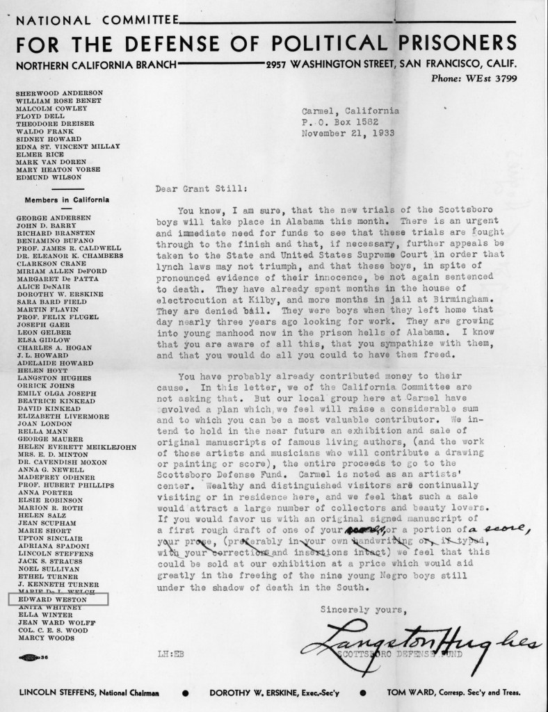 Weston not only donated photographs to the sale, he was a member of the Northern California Branch of the National Committee for the Defense of Political Prisoners. Indeed, his name appears on the roster of members printed on the organization’s letterhead, as seen in a solicitation letter sent by Hughes to Grant Still, the renowned African-American classical composer, conductor and arranger. Dated 21 November 1933 and hand annotated to apply specifically to Still, Hughes asks the musician to contribute a score to the upcoming benefit. Hughes’ letter reads, in part:
