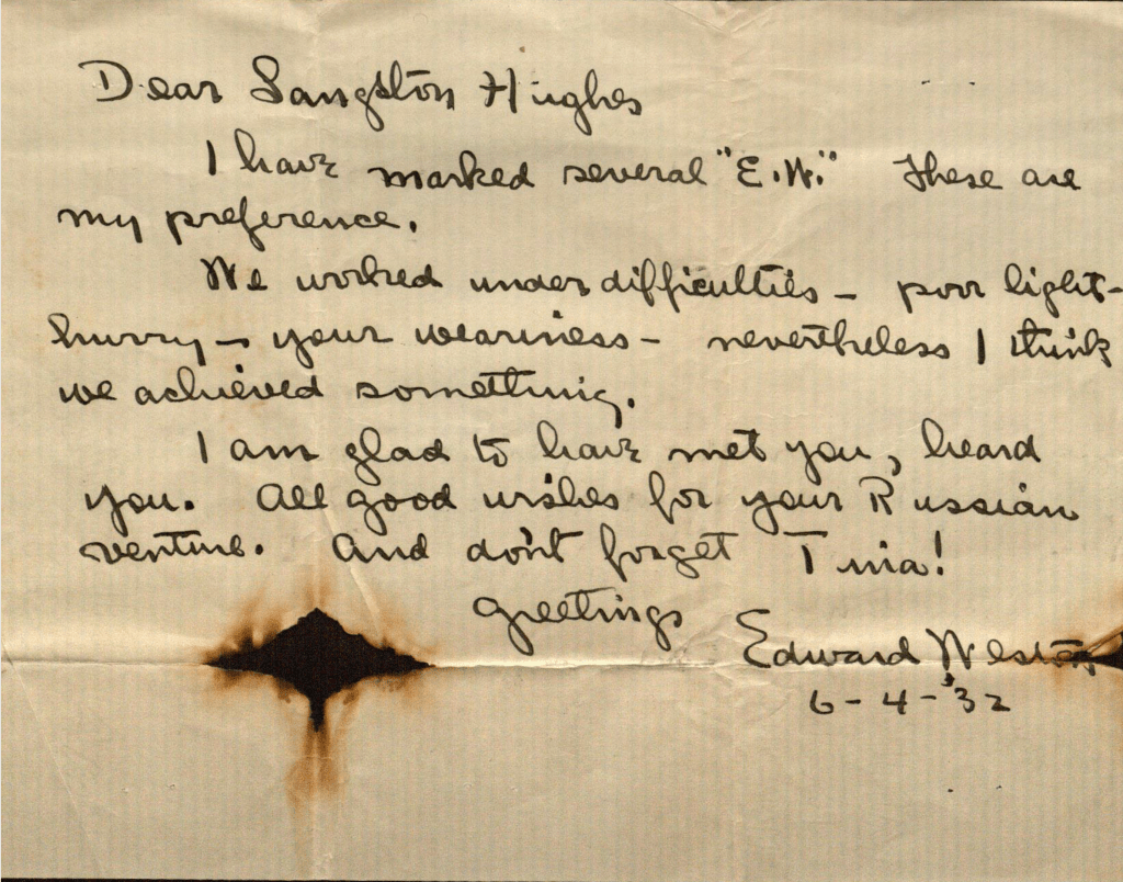 4 Letter, Edward Weston to Langston Hughes, dated 4 June 1932. (Beinecke Rare Book & Manuscript Library, Yale University, James Weldon Johnson Collection, Langston Hughes Papers; JWJ MSS 26; Box 169, folder 3098: Series XIV. Personal Papers, Project Files; National Committee for the Defense of Political Prisoners (Scottsboro exhibition and sale).)