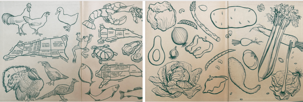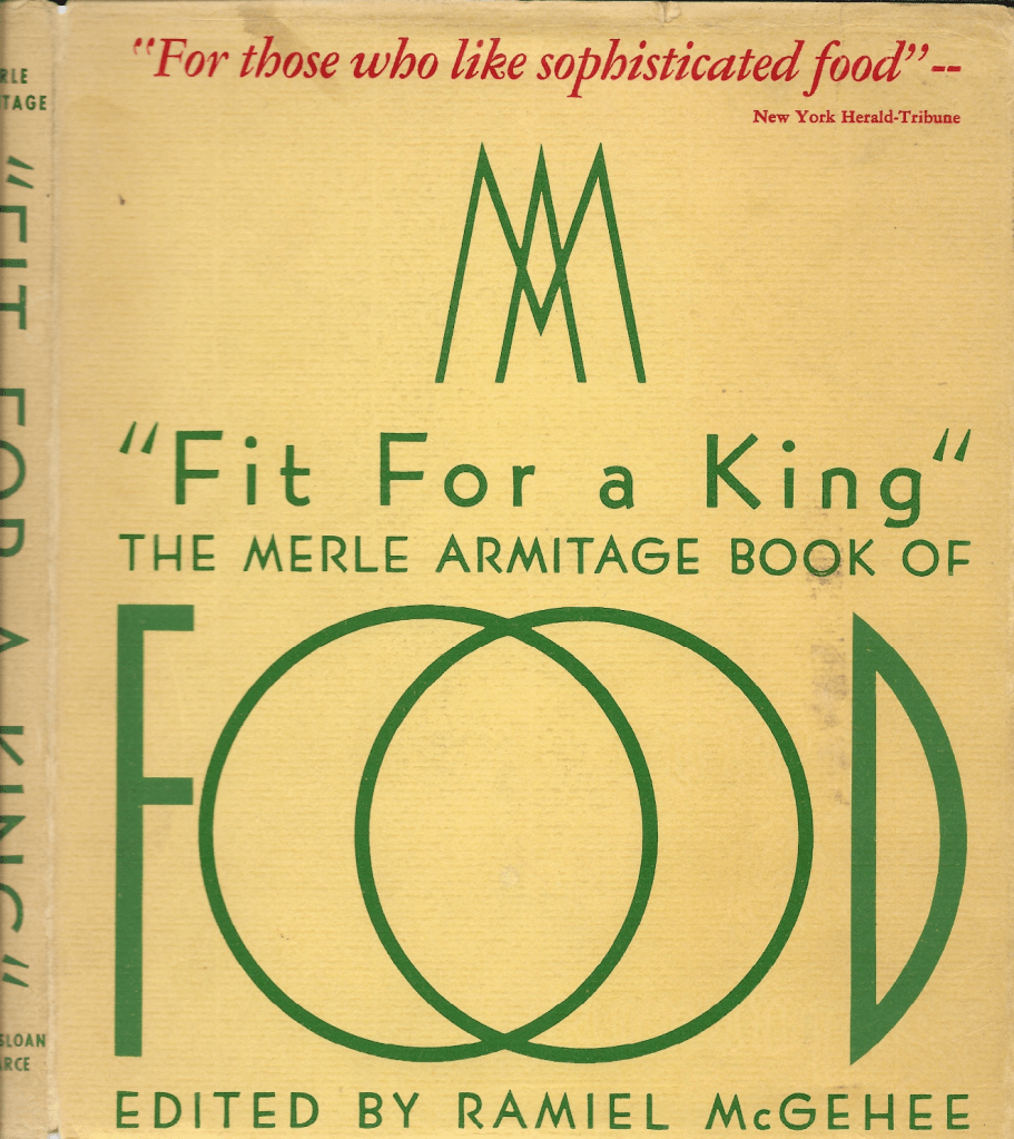 “Fit for a King: the Merle Armitage Book of Food,” edited by Ramiel McGehee (Longmans,) is a sumptuous book, oozing richness and palpitant with temptation. Culinary authorities too numerous to mention, literary folk, dancers, actors, singers, epicures all, contribute recipes for their favorite dishes. And Edward Weston, great photographer, tempts us with photographs of winking vegetables. The Times-Mirror has made this fine cookbook into a volume of beauty; and philosophic essays on food and conversation serve to stimulate saliva, promote digestion and to keep the liver from enlarging too, too much. A man’s book of food that will make your mouth water.[35]