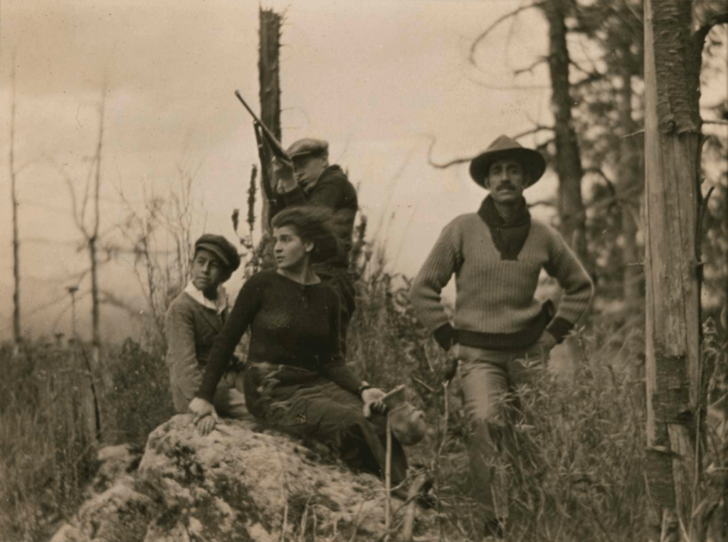 Sunday. Tina, Chandler, and Edward: Galván [Manuel Hernandez Galván] invited us to join him for an outing. In a high powered car, sixty miles an hour, we climbed the road to Toluca. Up, we roared … through old towns, then into pineclad mountains. Once we were stopped by soldiers, ready for action, and significantly reminded of the revolution. But a flourish of Galván’s pass, and recognition of a general amongst us, changed the surly attitude to a salute. / Lunch under the pines—tortillas, hot from the ashes of a bonfire, frijoles y carne—beans and meat—and plenty to drink—tequila y cerveza—beer. …[9]