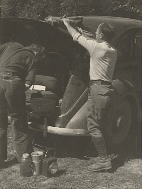 … / The first and most important item was a car. Since I don’t drive there was always at least one other person along. Considering the bulky equipment to be carried, we decided to get a touring sedan, and by luck I was able to get a new one rather than the second-hand one my budget allowed for. In a less reliable car I would never have risked some of the cow tracks we have been over. Other equipment consisted of sleeping bags, tent, gasoline stove, cookset, shovel and axe, two 2-gallon canteens and a pint one, thermos bottle, drycell lantern. / … / When there was enough to do to keep us in one place several days we usually put up the tent so as to have a place to leave the bulk of our equipment. / … / In the mornings we were usually up at dawn. Often I would work until dusk and we would have to scramble for a camping place in the gathering darkness. But only twice in the summer and fall months were we thwarted in finding one and forced to turn to auto camps for shelter. … We carried none of the usual camper’s culinary necessities: flour, bacon, etc. Time was too important to be wasted on cooking. We had one hot meal at night, a stew, made by combining the contents of several cans. During the day we would have any number of snacks as hunger dictated and for these we took Swedish bread and whole wheat crackers / (which do not mould or dry up as bread would), a whole Monterey jack cheese (which ripens beautifully in changing climates), nut-butter, jam, honey, powdered milk, and dried fruits. At the start of a trip and when we passed through towns these were supplemented with fresh fruit and milk, butter, eggs, etc. Neither did we allow time off for wash days, but carried sufficient changes of clothing to get us through the whole trip. / I have gone into these facts at some length simply to stress this point: without such thorough simplification in our daily living I could not have made the twelve hundred negatives. … [14]