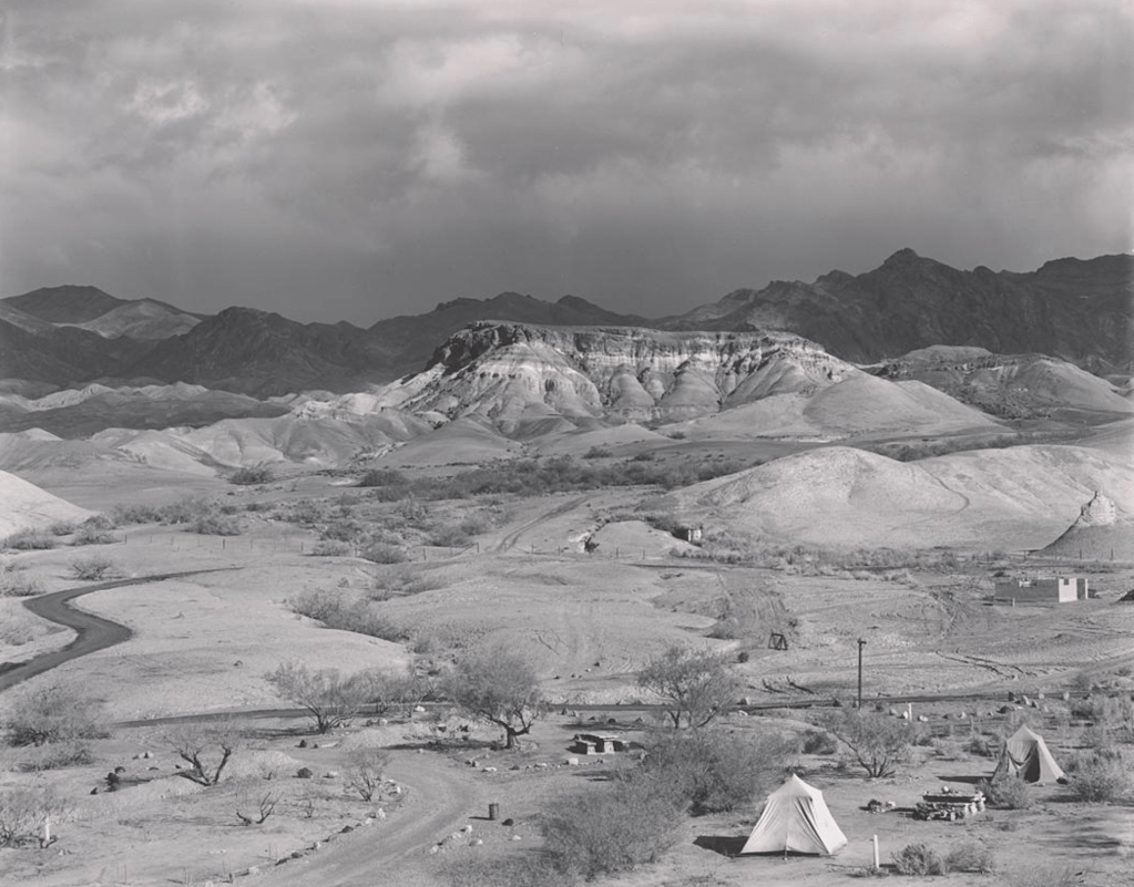 Food becomes a passionate interest when you are moving around. As described in the book, we started off each day with a quick bracing cup of coffee. Breakfast usually came at midmorning, after a couple of hours of work or driving, and lunch set in whenever hunger called for it. We equipped ourselves with dried fruit and nuts to tide us over between meals. Edward considered it a sin to waste good daylight by cooking, so we usually took our ready-to-eats in hand or aluminum cup—dry cereal, canned or fresh fruit, crackers, cheese, nut butters, sardines. The secondary function of these meals was to break up the long days and bring us together for some rest and talk. … A typical stew recipe called for: a jar of chicken egg noodles, cans of corn, tomatoes and tamales, with some jack cheese melted on top. Any surplus was stored in the jar and added to the next night’s stew. … / The simple fare was relieved by local specialities along the way, such as date milk shakes, fresh lake trout, or the nearly black locust honey we discovered one day in a grocery in Julian. Then, too, there was the odd bit of luck, such as the memorable feast we had just after New Year’s 1939 at the fashionable Furnace Creek Inn in Death Valley. The proprietress, a capable-looking gray-haired lady named Miss Ronan, had asked Edward to show prints to her guests. Despite our rough desert attire—the only clothing we had—she insisted that we return the following night as dinner guests. From the lordly bill of fare, we selected delicacies such as cream of artichoke soup, broiled lamb chops, sirloin of beef, creamed spinach, and fell upon the meal with appetites enlarged by two weeks of camp life. There was no check but we paid for it after all.[15]