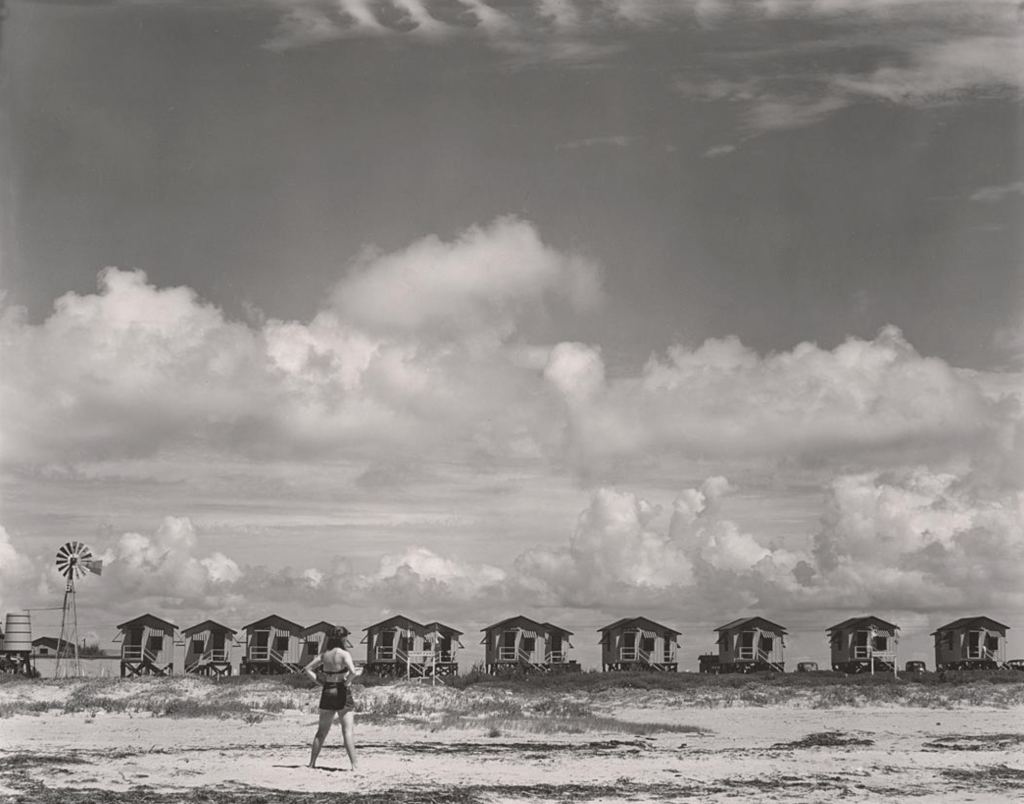 The autocamps [sic] on the seawall were priced out of sight. Our first inquiry got a $5.00 quote; our second—for a little hole-in-the-wall—was $2.50. Outraged, we continued several miles along the seawall to where cars could drive at the water’s edge and Sunset Beach Camp would supply us with a raised tent-house for $1.50. We did not hesitate, because there was still time for a swim. … / … We woke the next morning drenched with sweat and unable to move in the furnace-like heat of the shack. We had slept late after a fitful night of suffocation and mosquitoes. Dragging ourselves down to the water, we crawled through the shallows and were sufficiently revived by the Gulf soup so that Edward returned for his camera and made a negative of the beach nuts with swimsuited me in the foreground.[22]