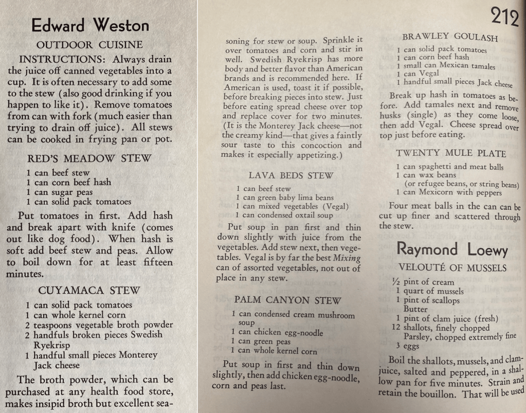 To enhance a cookbook with such iconic vegetable still lifes is hardly surprising, but Weston’s second contribution to Fit for a King certainly is. Nestled amongst the book’s haute cuisine, in a chapter titled “Inheritors of the ‘Cordon Bleu’”[31] is a selection of Weston’s camping recipes. Under the heading “Edward Weston Outdoor Cuisine” we find six decidedly non-epicurean, exceedingly simple, yet oddly appealing offerings. Comprised largely of canned ingredients, they are: “Red’s Meadow Stew,” Cuyamaca Stew,” Lava Beds Stew,” “Palm Canyon Stew,” “Brawley Goulash,” and “Twenty Mule Plate.”[32] Each pays homage to a location visited during the Guggenheim travels. Indeed, the genesis of “Red’s Meadow Stew” is noted in California and the West: