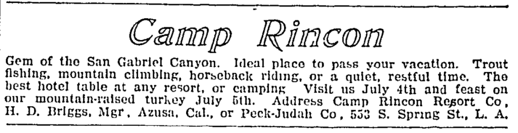 2 “Out-of-Town-Society: Miss Flora Chandler and Miss Emily Ellias…,” Los Angeles Sunday Times, 11 August 1907, Section VI, p. 8. For more information on Rincon Camp see the Homestead Museum blog: “The Homestead Blog: Creating Advocates for History Through the Stories of Greater Los Angeles”.