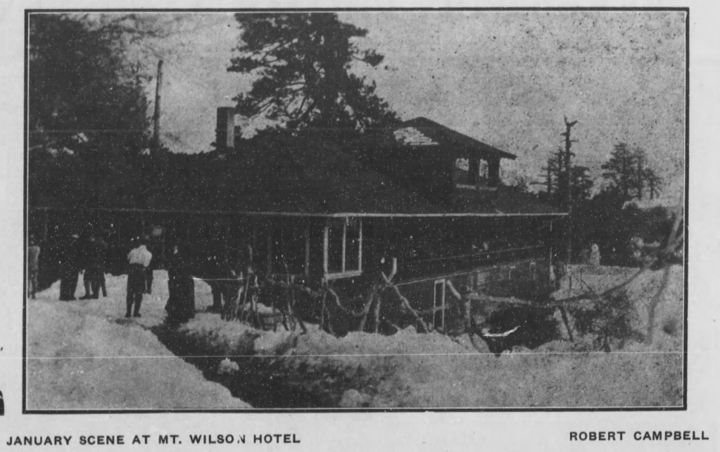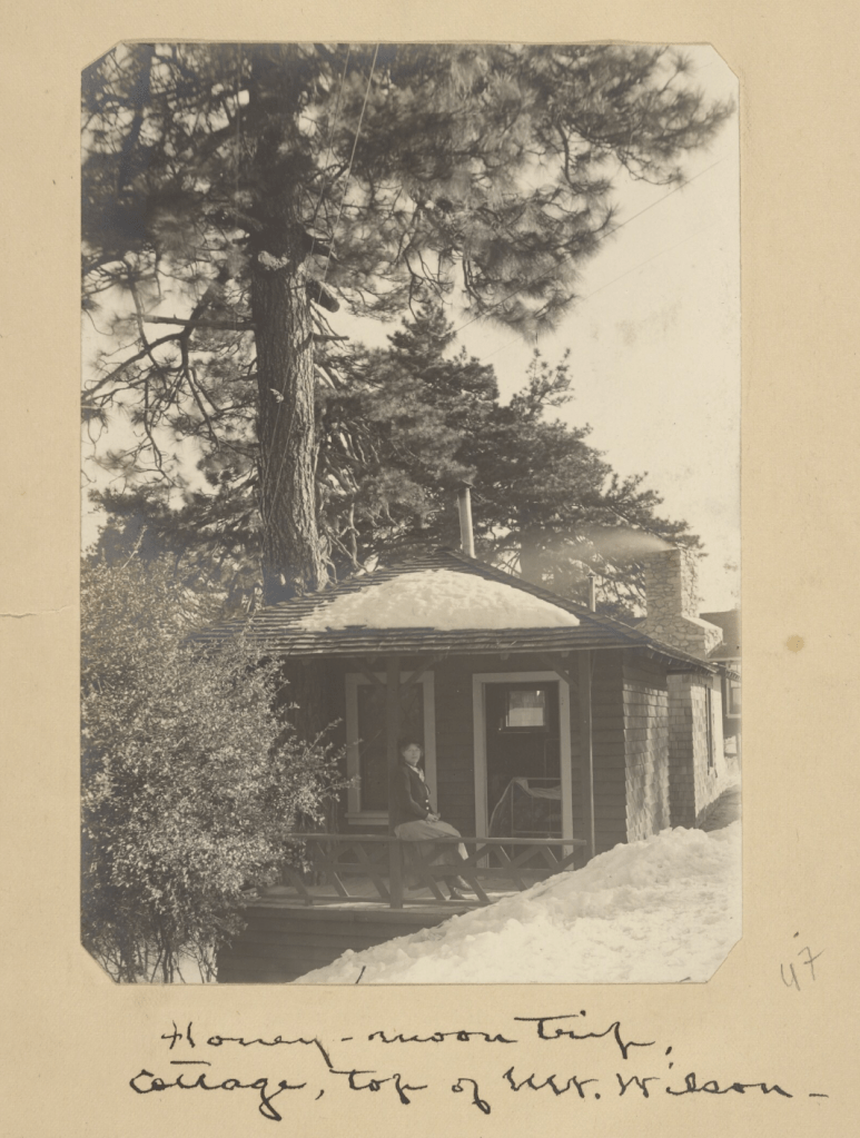 By December 1907, Edward and Flora were engaged,[4] although the wedding did not take place until January 1909.[5] Appropriately enough, the couple celebrated their honeymoon in the nearby San Gabriel mountains. This time they opted for a cabin at the top of Mount Wilson, likely one offered by the Mount Wilson Hotel. Weston’s snapshot of Flora on their cottage porch, as well as a 1909 Los Angeles Herald photo of a “January Scene at Mt. Wilson Hotel,” picture a glorious snow-laden locale for their winter idyl.
