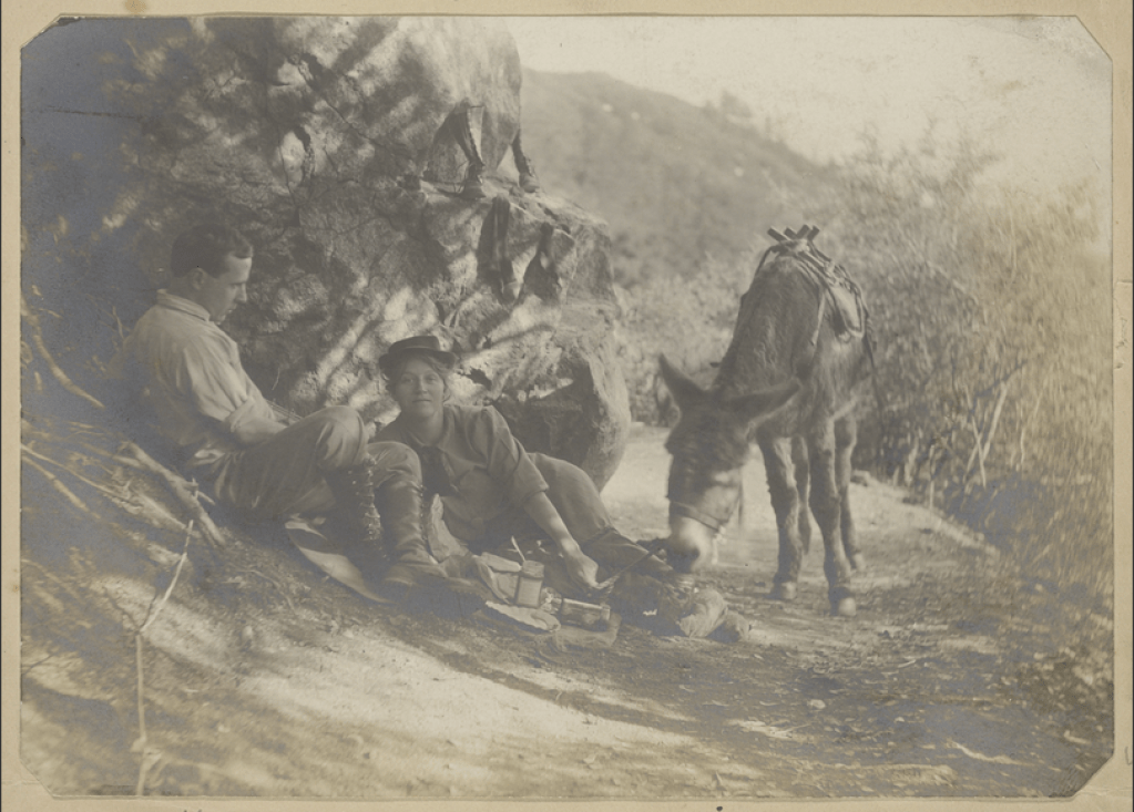 During their stay, the honeymooners likely dined at the hotel and/or in their cottage, but while out exploring they chose fare similar to that on their earlier camping venture. In a self-portrait (Weston’s shutter release cable is evident at lower left), Edward, Flora and their burro pause for refreshment on a mountain trail.[6] Visible in the foreground are a spoon in an open jar, a box or tin of what appear to be crackers, and a paper plate—a disposable convenience only recently introduced into popular usage.