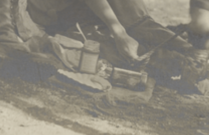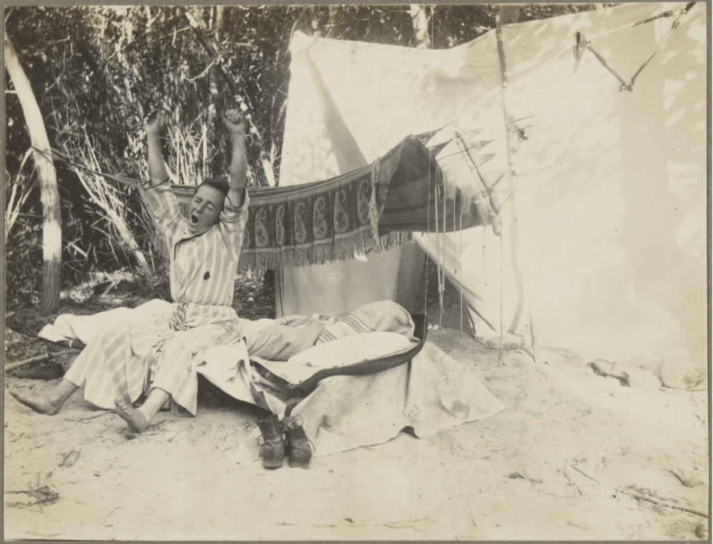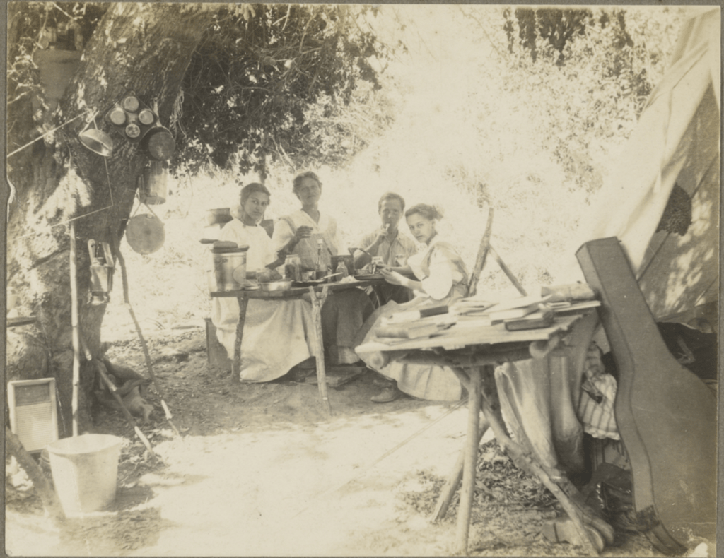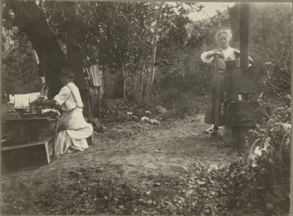 Camp Rincon—a popular retreat in the San Gabriel Canyon—boasted a variety of features, from tents (furnished and unfurnished) to fresh food, a dining hall, and a music/dance pavilion. Guests could avail themselves of trout fishing, hiking, horseback riding, a pool, tennis and croquet. We don’t know which amenities Weston and friends utilized, but they clearly enjoyed a modicum of creature comforts on their trip. These included tents, cots, blankets and pillows; a hammock for sleeping beneath the stars or lazying away an idle hour; rustic tables and wooden crates for dining, seating and storage; cooking, cleaning and laundry supplies; and a guitar, books and magazines for campsite entertainment. Snacks and meals remained close at hand thanks to food in jars, tins and bottles while a camp stove facilitated the preparation of hot meals. What the majority of those meals consisted of is unrecorded, but the title of one photograph tells us pea soup was on the menu!