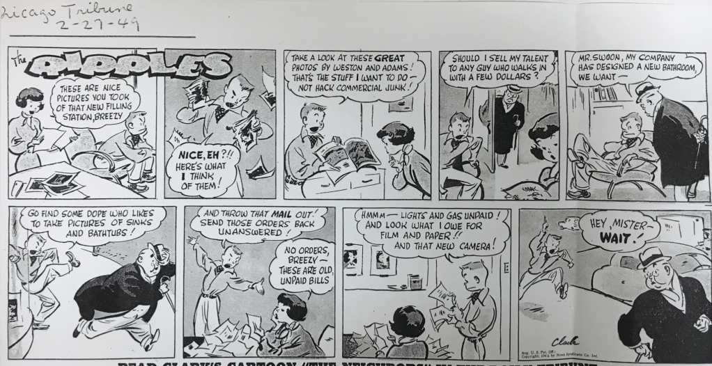 Artistic acclaim and celebrity manifest in many forms. But I ask you, what could be more auspicious than a nod from a nationally syndicated comic strip? Especially when that strip commands a half-page in the Sunday color comics! Such was the case on 27 February 1949 when cartoonist George Clark conjured both Edward Weston and Ansel Adams as models for an aspiring photographer in his popular weekly strip, “The Ripples.” A bemused Weston clearly appreciated the “honor.” On a visit to Weston’s home a year later, San Francisco Chronicle arts columnist Kevin Wallace noticed the clipping sitting on a table and recorded Weston’s response to it: “When we found ourselves in the funny papers, Ansel and I realized we had arrived.”[2]